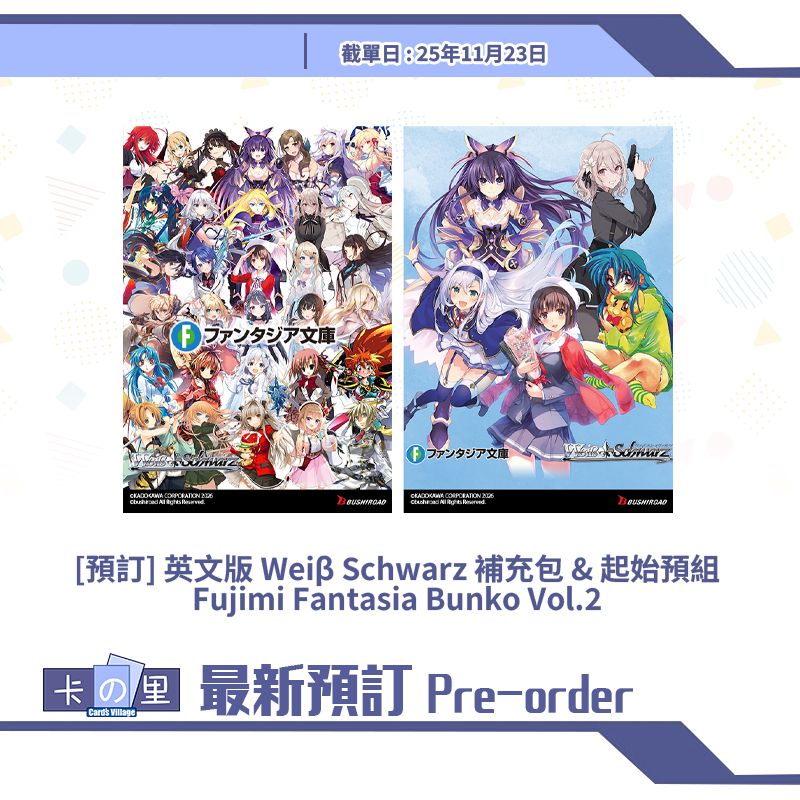 [預訂] 英文版 Weiβ Schwarz 補充包 & 起始預組 Fujimi Fantasia Bunko Vol.2補充包: 裝箱單位:一箱 / 24 盒 | 一盒 / 12 包起始預組: 裝箱單位:一箱 / 8 條 | 一條 / 6 個