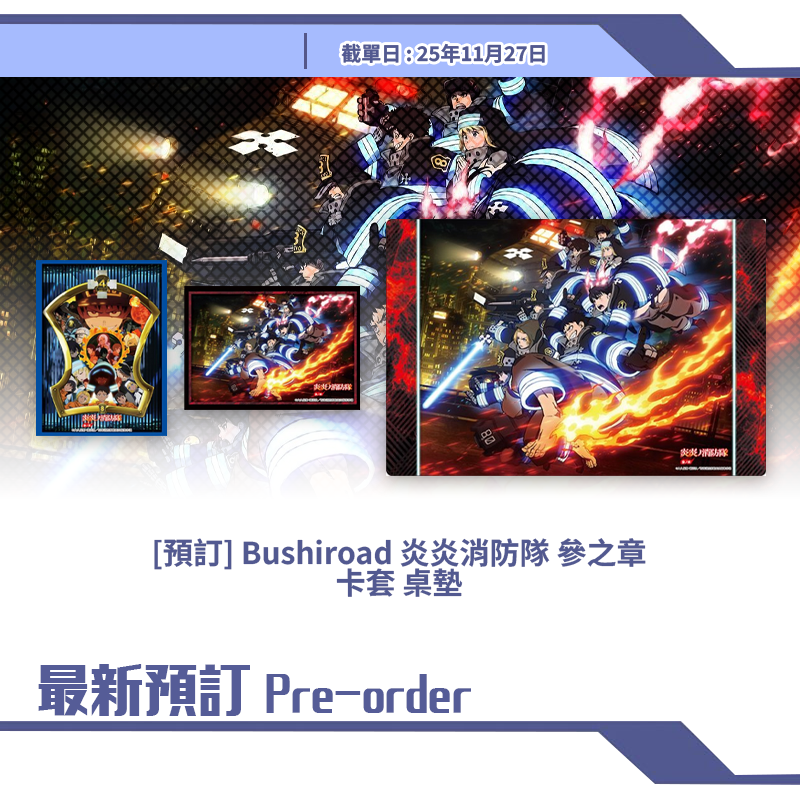[預訂] Bushiroad 炎炎消防隊 參之章 卡套 桌墊卡套 スリーブ75枚入り サイズ:縦92×横67mm桌墊 製品素材:ポリエステル、ラバー 中国製 ; サイズ:縦350mm×横520mm×厚さ2mm