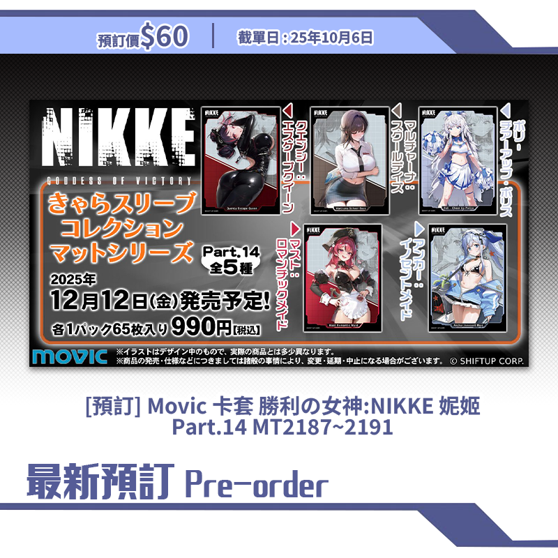 [預訂] Movic 卡套 勝利の女神:NIKKE 妮姬 Part.14 MT2187~2191預訂價$60/包きゃらスリーブコレクション マットシリーズ 勝利の女神:NIKKE (65枚入り)スリーブ65枚入りサイズ:縦92×横67mm